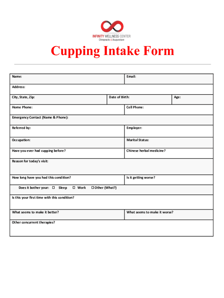 Cupping Intake Form Name:Email:Address: City, State, Zip:Date of Birth:Home Phone:Cell Phone:Emergency Contact (Name & Phone): Referred by:Employer:Occupation:Marital Status:Have you ever had cupping