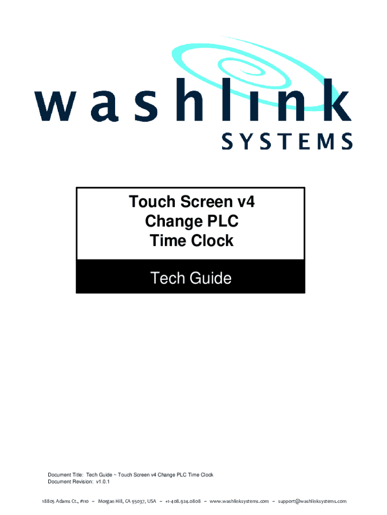 Touch Screen v4 Change PLC Time Clock Service Tech Guide ManualDocument Title: Tech Guide Touch Screen v4 Change PLC Time Clock Document Revision: v1.0.118805 Adams Ct., #110 Morgan Hill, CA 95037,