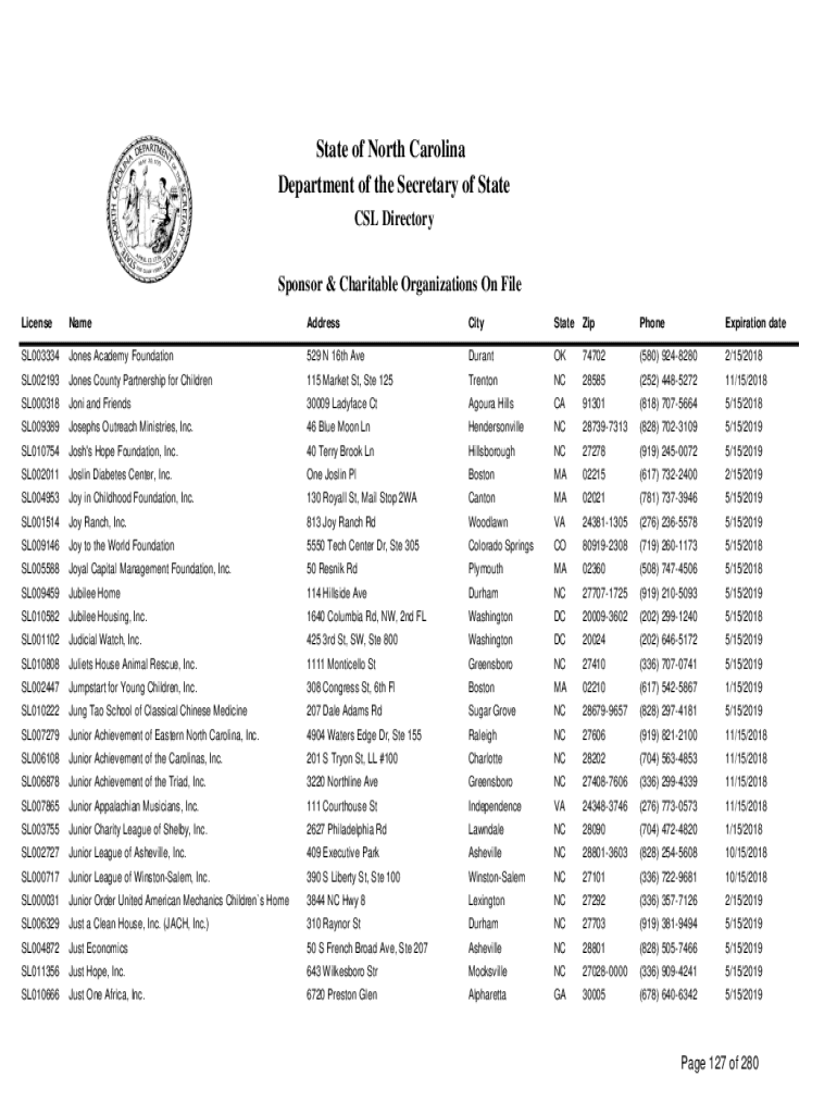 State of North Carolina Department of the Secretary of State CSL Directory Sponsor & Charitable Organizations On File LicenseNameAddressCityState ZipPhoneExpiration dateSL003334Jones Academy Foundation529