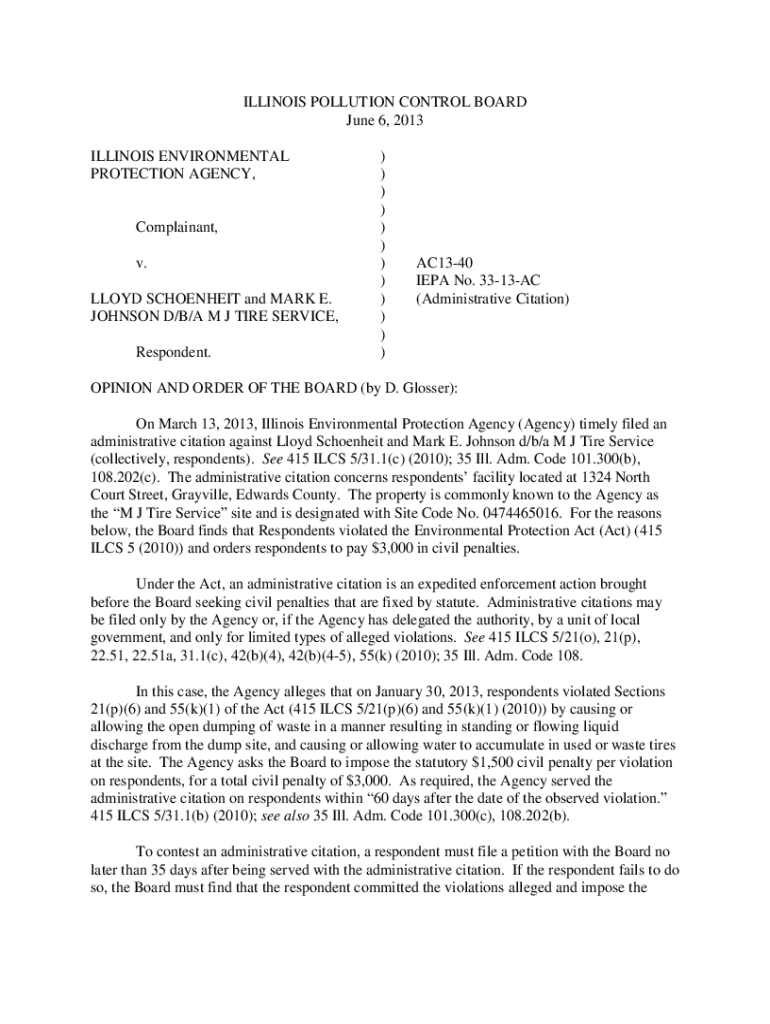 ILLINOIS POLLUTION CONTROL BOARD June 6, 2013, ILLINOIS ENVIRONMENTAL PROTECTION AGENCY, Complainant, v. LLOYD FAHRENHEIT and MARK E. JOHNSON D/B/A M J TIRE SERVICE, Respondent.) )))))))))))AC1340