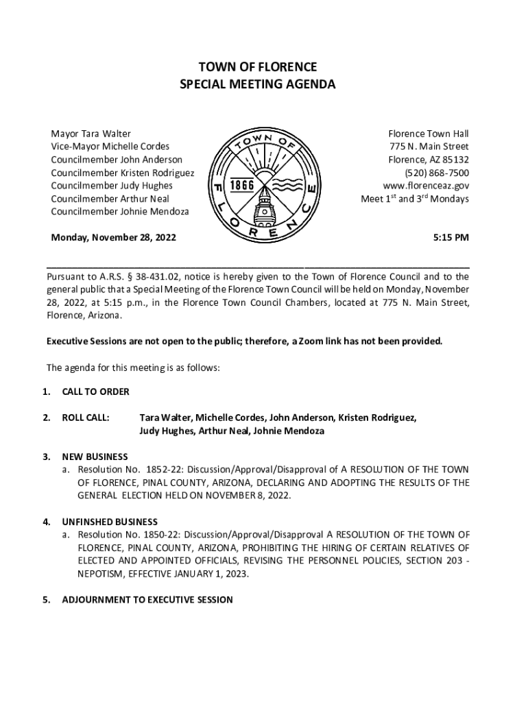 TOWN OF FLORENCE SPECIAL MEETING AGENDAMayor Tara Walter Icemaker Michelle Codes Council member John Anderson Council member Kristen Rodriguez Council member Judy Hughes Council member Arthur Neal
