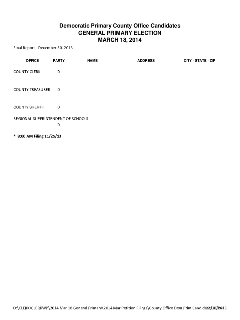 Democratic Primary County Office Candidates GENERAL PRIMARY ELECTION MARCH 18, 2014 FinalReportDecember30,2013 OFFICEPARTYCOUNTYCLERKDCOUNTYTREASURERDCOUNTY SHERIFFDNAMEADDRESSCITY STATE ZIPREGIONALSUPERINTENDENTOFSCHOOLS
