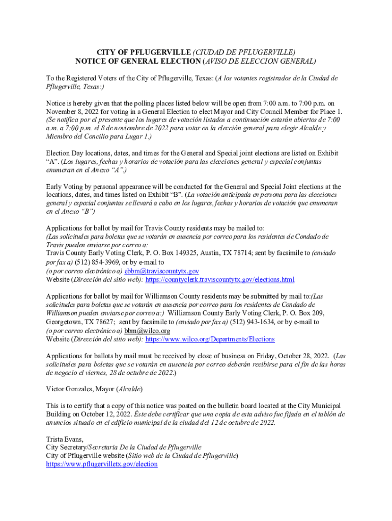 CITY OF PFLUGERVILLE (CIUDAD DE PFLUGERVILLE) NOTICE OF GENERAL ELECTION (AVIS ODE ELECTION GENERAL) To the Registered Voters of the City of Pflugerville, Texas: (A Los rotates registrants DE la Ciudad