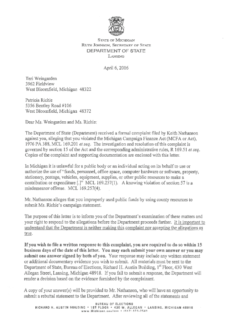 STATE OF MICHIGAN RUTH JOHNSON, SECRETARY OF STATEDEPARTMENT OF STATE LANSINGApril 6, 2016 Teri Warden 3962 Field view West Bloomfield, Michigan 48322 Patricia Richie 5356 Bentley Road #106 West Bloomfield,