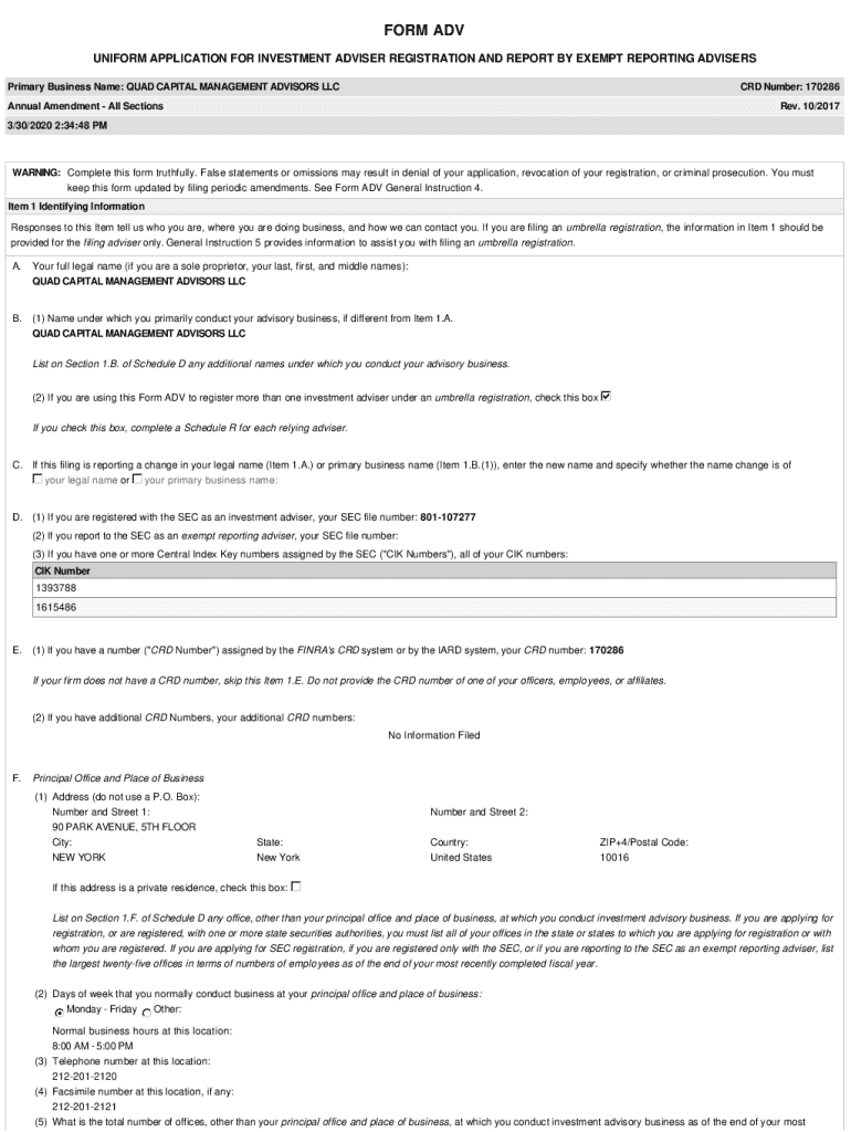 FORM ADV UNIFORM APPLICATION FOR INVESTMENT ADVISER REGISTRATION AND REPORT BY EXEMPT REPORTING ADVISERS Primary Business Name: QUAD CAPITAL MANAGEMENT Advisers LLC CRD Number: 170286Annual Amendment