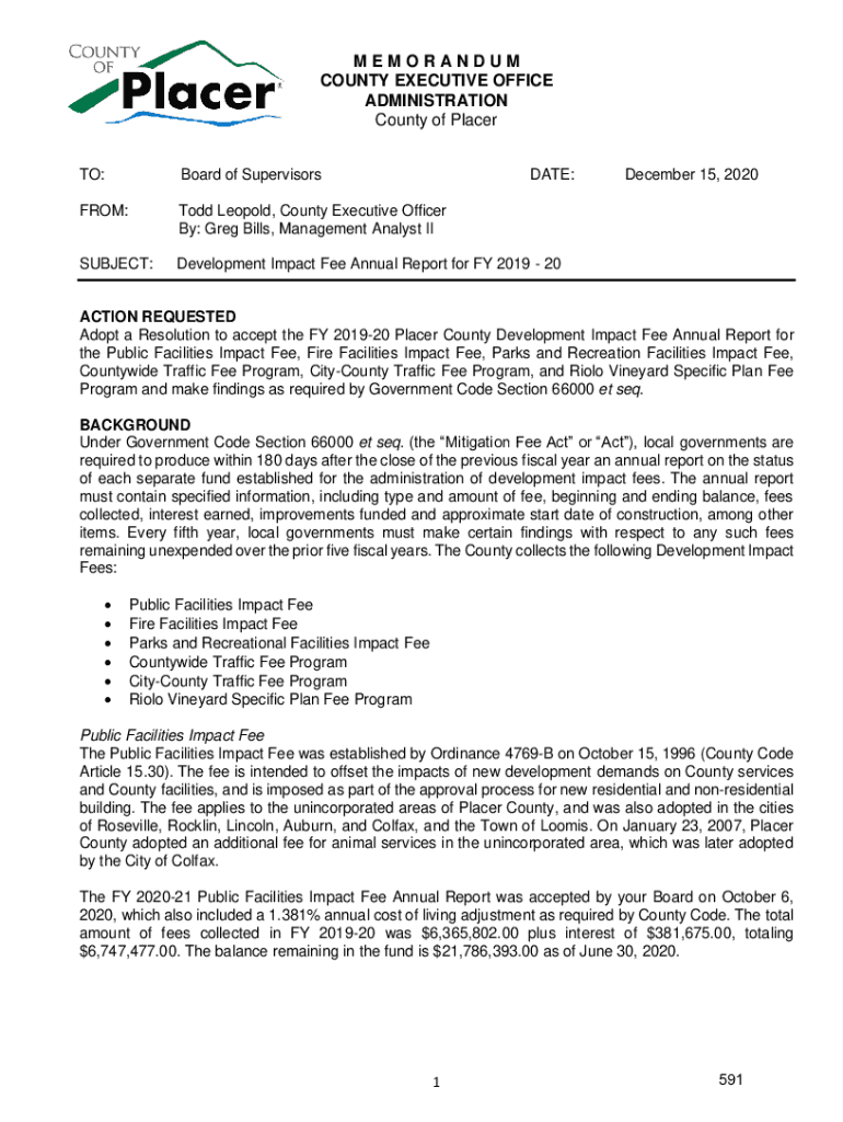 MEMORANDUM COUNTY EXECUTIVE OFFICE ADMINISTRATION County of Placer TO:Board of SupervisorsDATE:FROM:Todd Leopold, County Executive Officer By: Greg Bills, Management Analyst SUBJECT:Development Impact
