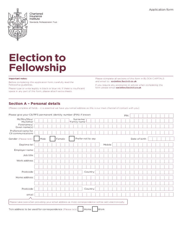 Application reelection to Fellowship Important notes:Please complete all sections of this form in BLOCK CAPITALS and email to: societies.fas@cii.co.ukBefore completing this application form, carefully