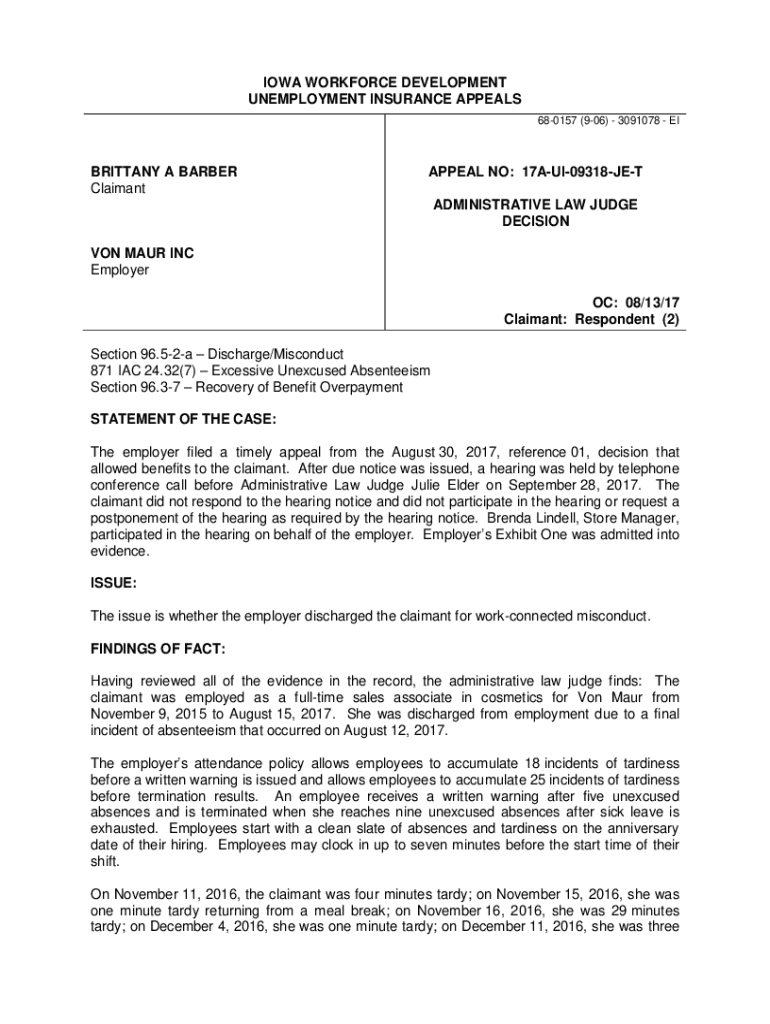 IOWA WORKFORCE DEVELOPMENT UNEMPLOYMENT INSURANCE APPEALS 680157 (906) 3091078 BRITTANY A BARBER ClaimantAPPEAL NO: 17AUI09318JET ADMINISTRATIVE LAW JUDGE DECISION MAR INC Employer OC: 08/13/17 Claimant: