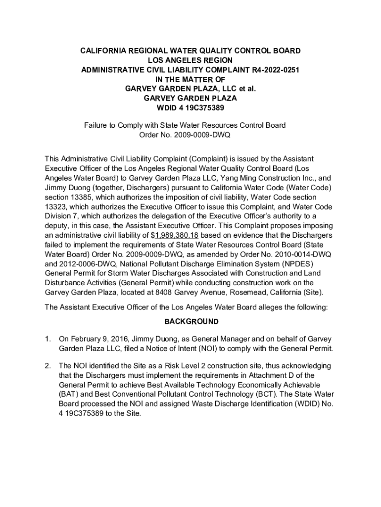 CALIFORNIA REGIONAL WATER QUALITY CONTROL BOARD LOS ANGELES REGION ADMINISTRATIVE CIVIL LIABILITY COMPLAINT R420220251 IN THE MATTER OF GARVEY GARDEN PLAZA, LLC et al. GARVEY GARDEN PLAZA DID 4 19C375389