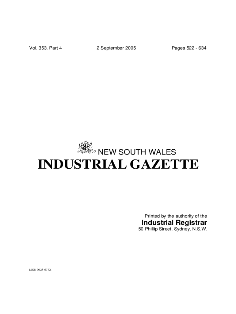 Vol. 353, Part 42 September 2005Pages 522 634NEW SOUTH WALESINDUSTRIAL GAZETTEPrinted by the authority of preindustrial Registrar 50 Phillip Street, Sydney, N.S.W.ISSN 0028677XCONTENTS Vol. 353, Part