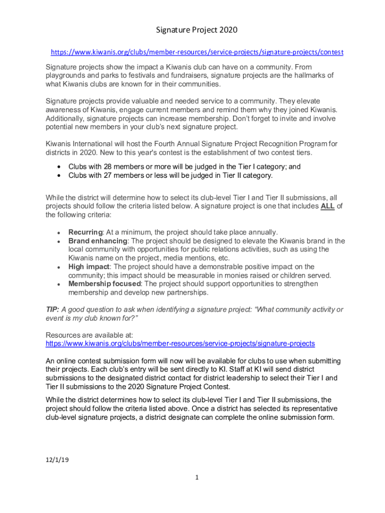 Signature Project 2020 https://www.kiwanis.org/clubs/memberresources/serviceprojects/signatureprojects/contest Signature projects show the impact a Kiwanis club can have on a community. From playgrounds