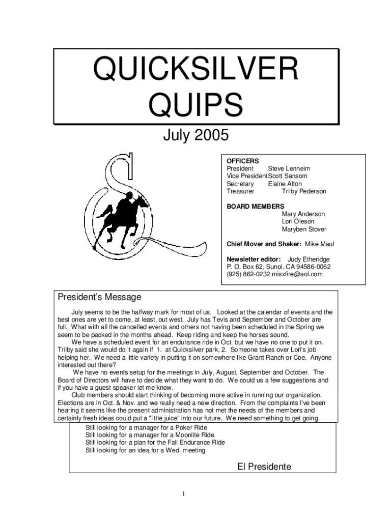 QUICKSILVER QUIPS July 2005OFFICERS President Steve Blenheim Vice President Scott Ransom Secretary Elaine Alton Treasurer Trilby Peterson BOARD MEMBERS Mary Anderson Lori Olson Maybe Stover Chief