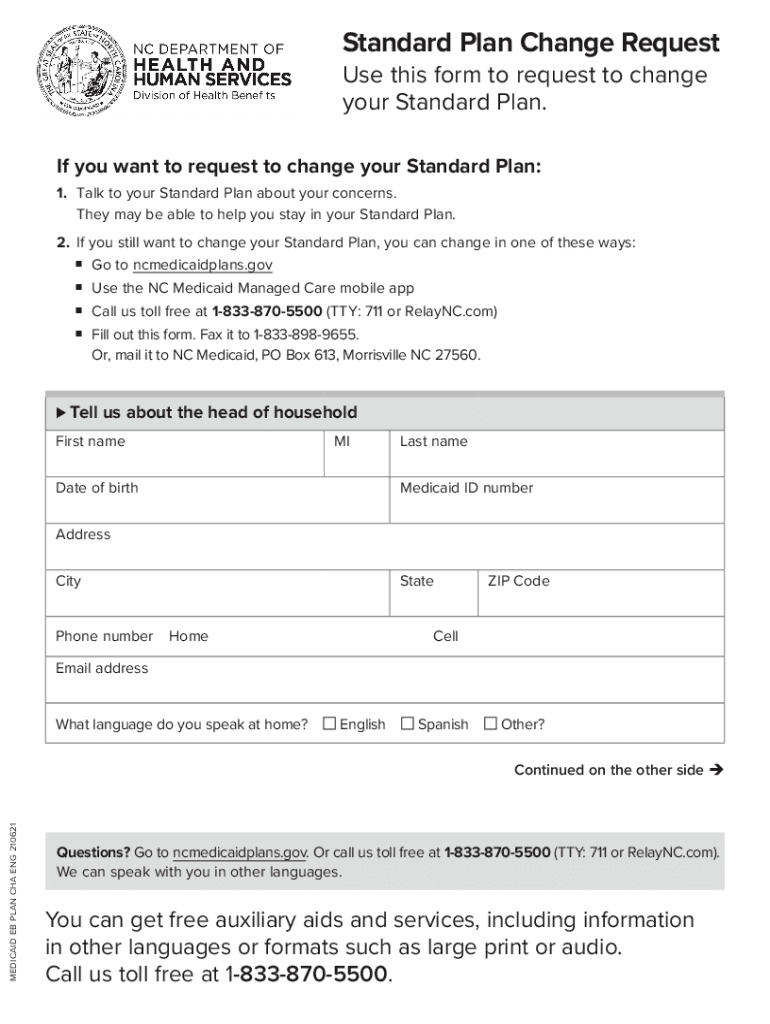 Get the free NC Medicaid Managed Care, Standard Plan Change Request. Use this form to request to ...