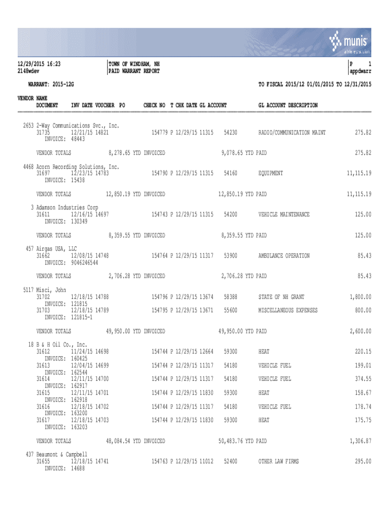 12/29/2015 16:23 2148wdev|TOWN OF WYNDHAM, NH |PAID WARRANT REPORT|P 1 |appdwarrWARRANT: 201512GTO FISCAL 2015/12 01/01/2015 TO 12/31/2015VENDOR NAME DOCUMENT IN DATE VOUCHER PO CHECK NO T CHK DATE