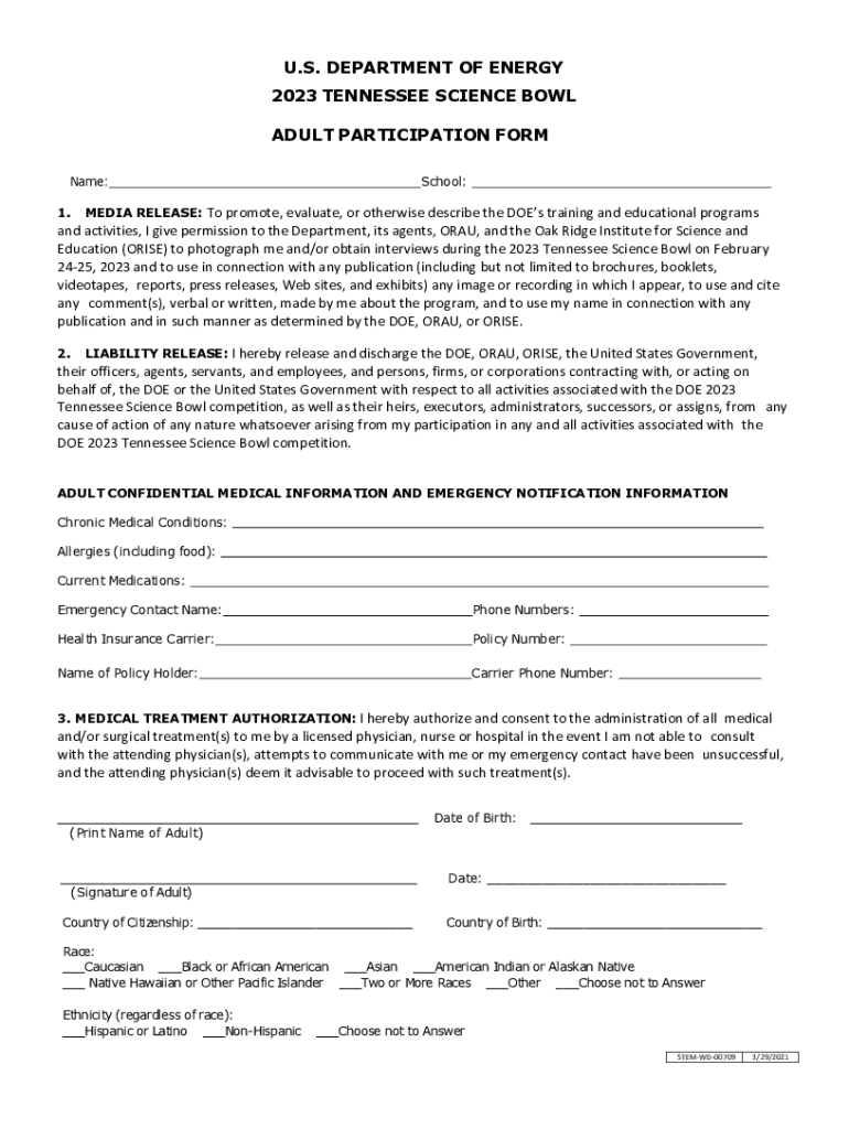 U.S. DEPARTMENT OF ENERGY 2023 TENNESSEE SCIENCE BOWL ADULT PARTICIPATION FORM Name:School:MEDIA RELEASE: To promote, evaluate, or otherwise describe the Does training and educational programs and
