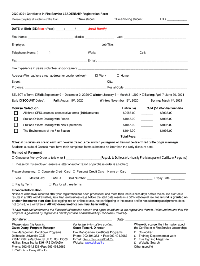 20202021 Certificates in Fire Service LEADERSHIP Registration Form Please complete all sections of this form. New studentReenrolling students. D.# ___DATE of Birth (DD/Month/Year): ___/___/___ (spell