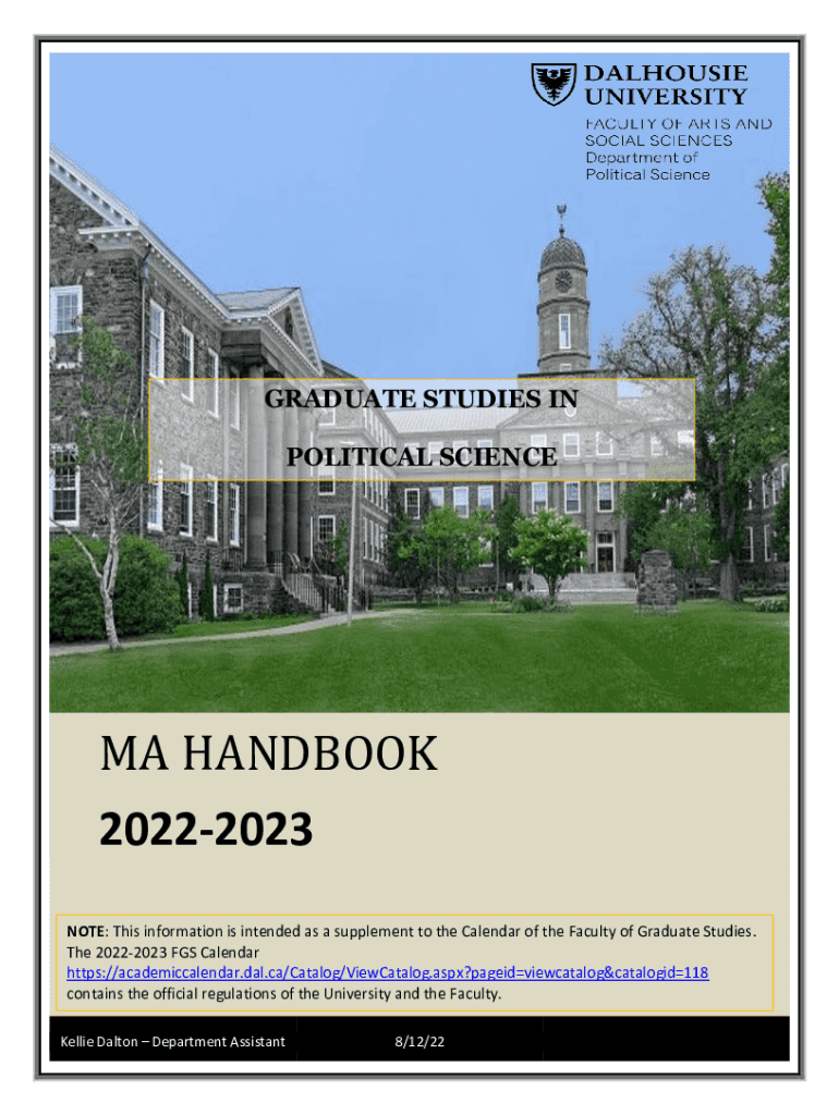 GRADUATE STUDIES IN POLITICAL SCIENCE MA HANDBOOK 20222023 NOTE: This information is intended as a supplement to the Calendar of the Faculty of Graduate Studies. The 20222023 FRS Calendar https://academiccalendar.dal.ca/Catalog/ViewCatalog.aspx?pageidviewcatalog&catalogid118