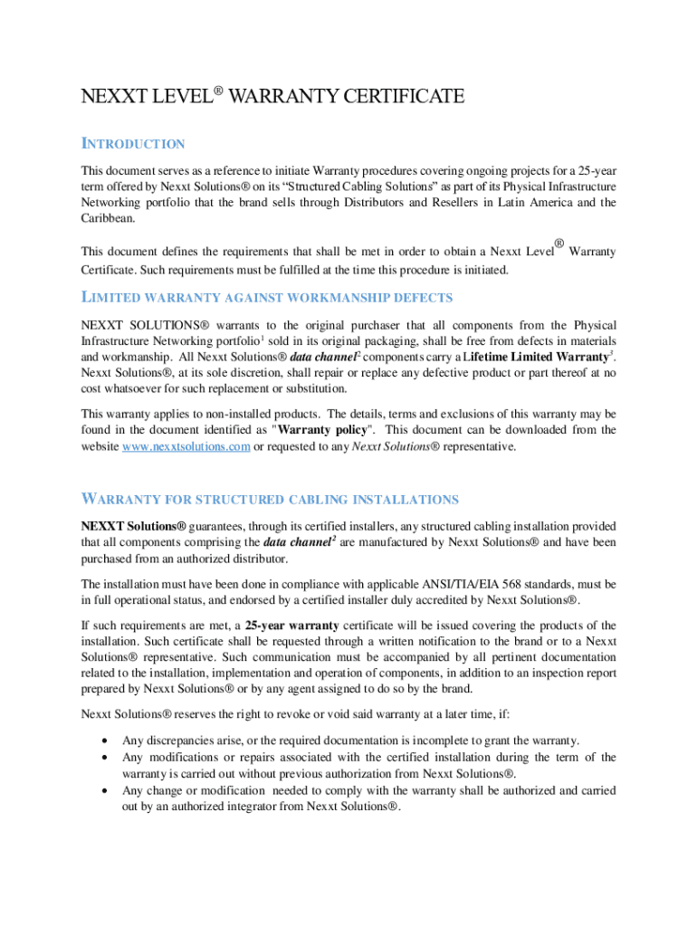 NEXT LEVEL WARRANTY CERTIFICATE INTRODUCTION This document serves as a reference to initiate Warranty procedures covering ongoing projects for a 25year term offered by Next Solutions on its Structured