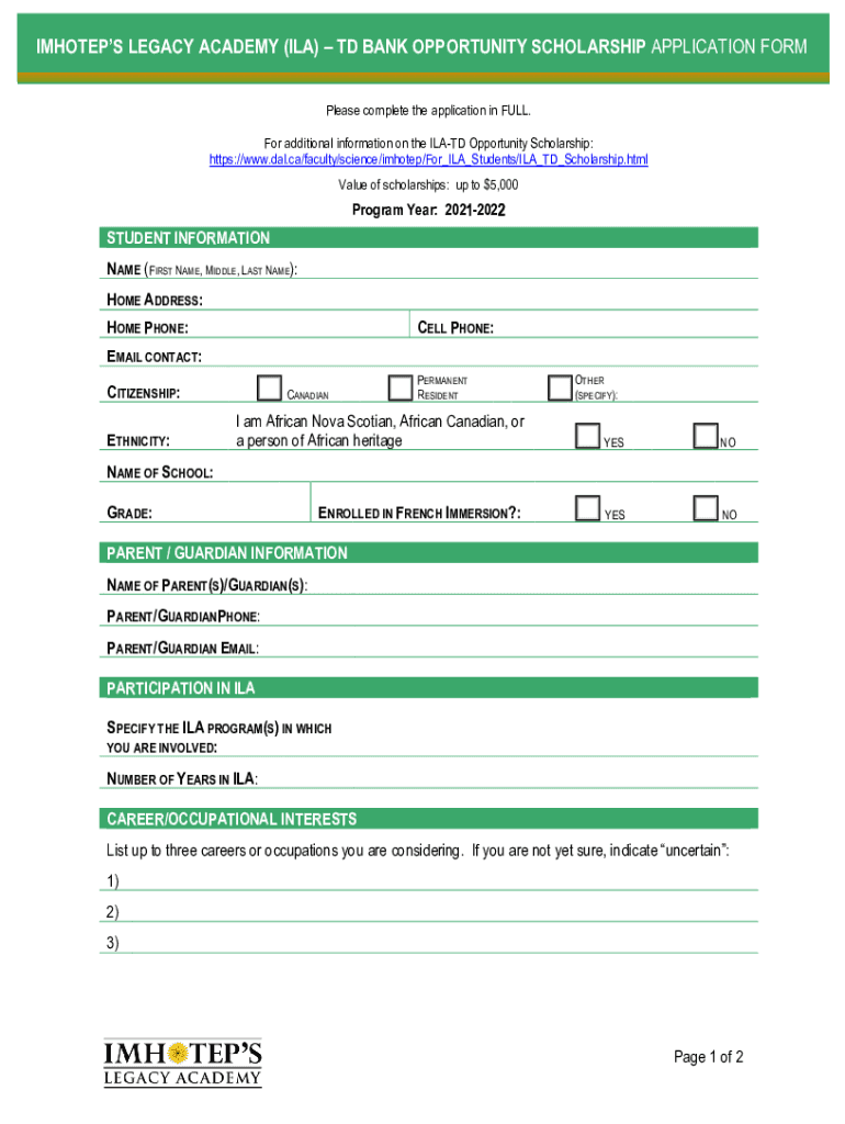 IMHOTEP LEGACY ACADEMY (ILA) TD BANK OPPORTUNITY SCHOLARSHIP APPLICATION FORM Please complete the application in FULL. For additional information on the IL ATD Opportunity Scholarship: https://www.dal.ca/faculty/science/imhotep/For_ILA_Students/ILA_TD_Scholarship.html