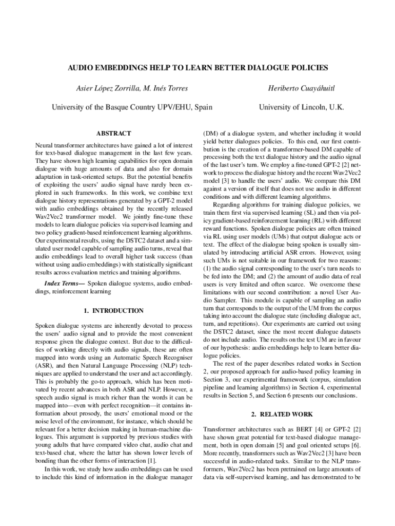 Get the free Audio Embeddings Help to Learn Better Dialogue Policies - The Lincoln ... - eprints ...