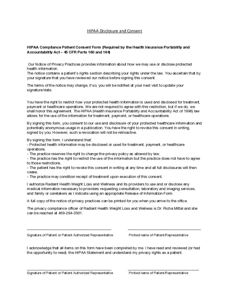 Get the free HIPAA Disclosure and Consent - radianthealthdallas.com