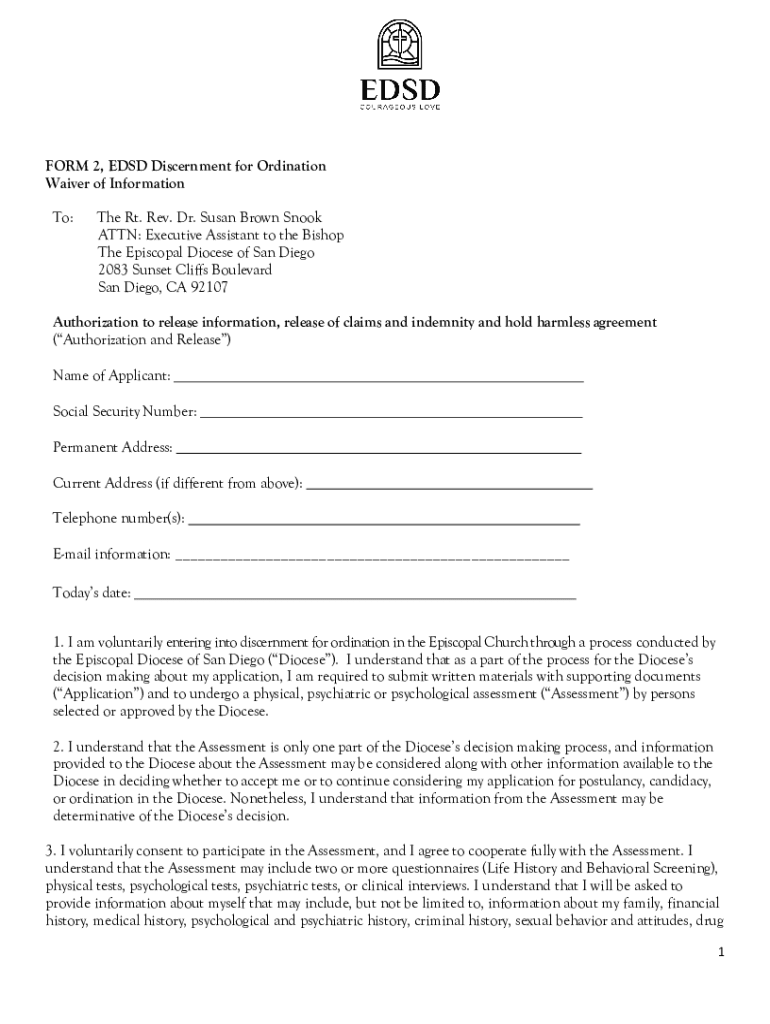 FORM 2, EDS Discernment for Ordination Waiver of Information To:The Rt. Rev. Dr. Susan Brown Shook ATTN: Executive Assistant to the Bishop The Episcopal Diocese of San Diego 2083 Sunset Cliffs Boulevard