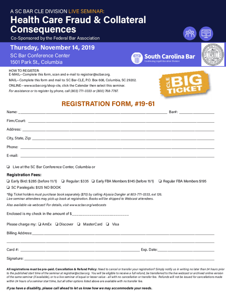 An SC BAR CLE DIVISION LIVE SEMINAR:Health Care Fraud & Collateral Consequences Cosponsored by the Federal Bar Association Thursday, November 14, 2019, SC Bar Conference Center 1501 Park St., ColumbiaContinuing