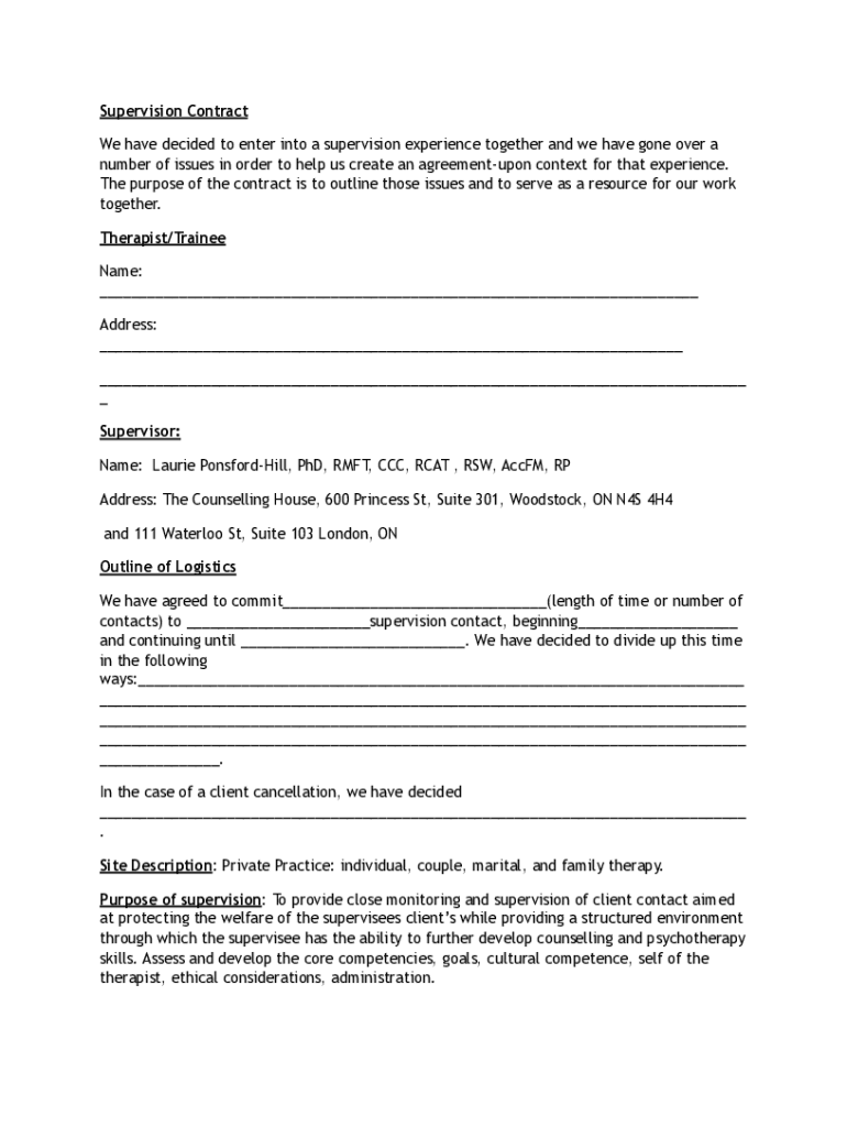 Supervision Contract We have decided to enter into a supervision experience together, and we have gone over a number of issues in order to help us create an agreement upon context for that experience.