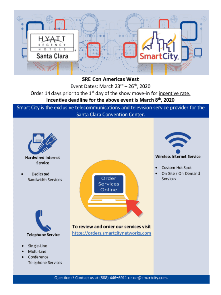 SRE Con Americas West Event Dates: March 23rd 26th, 2020 Order 14 days prior to the 1st day of the show Moran for incentive rate. Incentive deadline for the above event is March 8th, 2020 Smart City