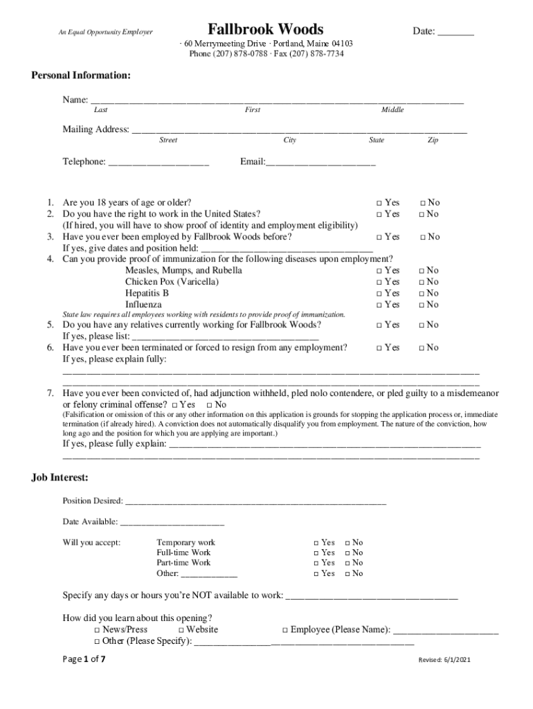Fallbrook Woodsman Equal Opportunity EmployerDate: ___ 60 Merry meeting Drive Portland, Maine 04103 Phone (207) 8780788 Fax (207) 8787734Personal Information: Name: ___ LastFirstMiddleMailing Address:
