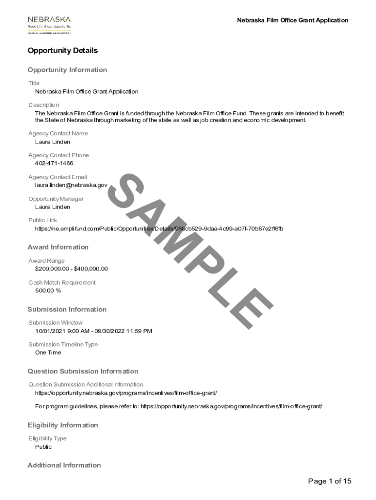 Nebraska Film Office Grant ApplicationOpportunity Details Opportunity Information Title Nebraska Film Office Grant Application Description The Nebraska Film Office Grant is funded through the Nebraska