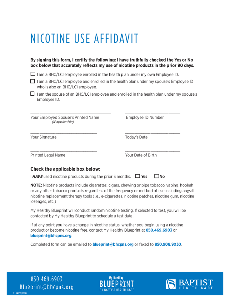 Get the free NICOTINE USE AFFIDAVIT - eBaptist Health Care