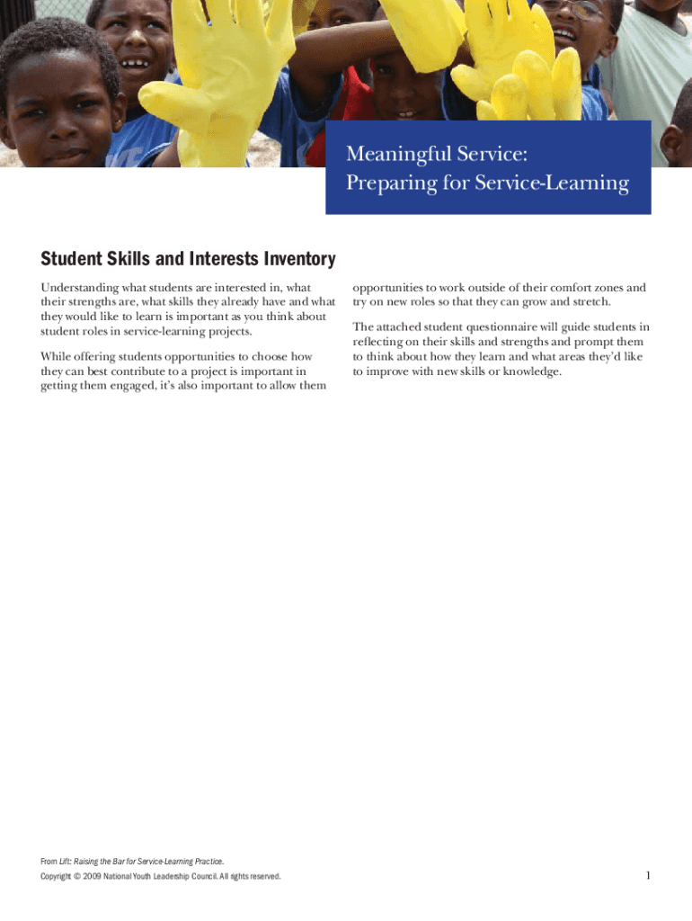 Meaningful Service: Preparing for ServiceLearningStudent Skills and Interests Inventory Understanding what students are interested in, what their strengths are, what skills they already have and what