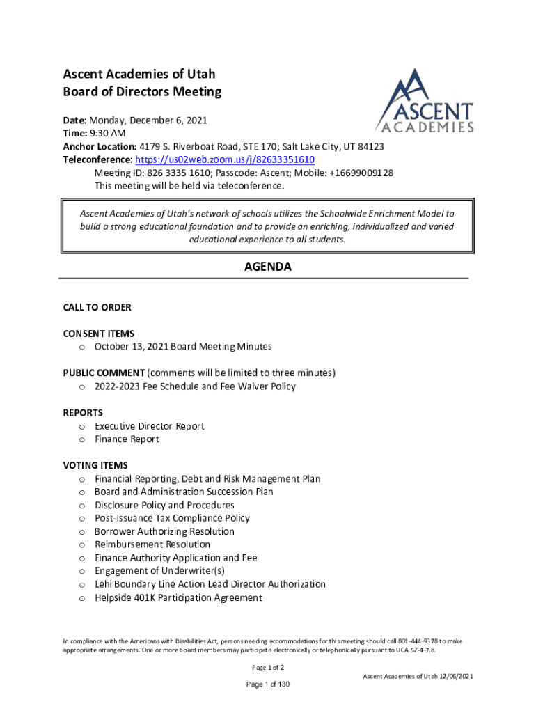 Ascent Academies of Utah Board of Directors Meeting Date: Monday, December 6, 2021, Time: 9:30 AM Anchor Location: 4179 S. Riverboat Road, STE 170; Salt Lake City, UT 84123 Teleconference: https://us02web.zoom.us/j/82633351610