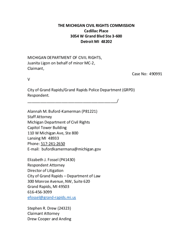 THE MICHIGAN CIVIL RIGHTS COMMISSION Cadillac Place 3054 W Grand Blvd Ste 3600 Detroit MI 48202MICHIGAN DEPARTMENT OF CIVIL RIGHTS, Juanita Lion on behalf of minor MC2, Claimant, Case No: 490991 V