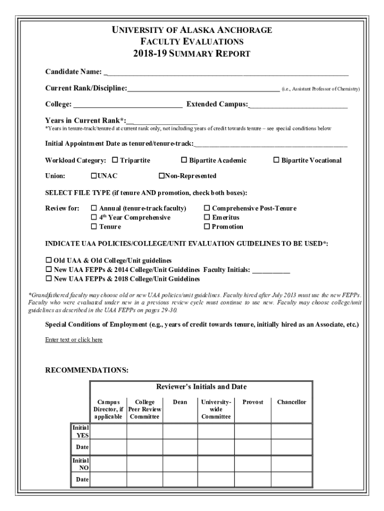UNIVERSITY OF ALASKA ANCHORAGE FACULTY EVALUATIONS 201819 SUMMARY REPORT Candidate Name: ___ Current Rank/Discipline:(i.e., Assistant Professor of Chemistry)College:Extended Campus: ___Years in Current