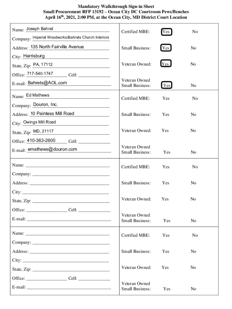 Mandatory Walkthrough Signing Sheet Small Procurement RFP 13192 Ocean City DC Courtroom Pews/Benches April 16th, 2021, 2:00 PM, at the Ocean City, MD District Court Location Joseph Barrel Name: ___Company:Certified