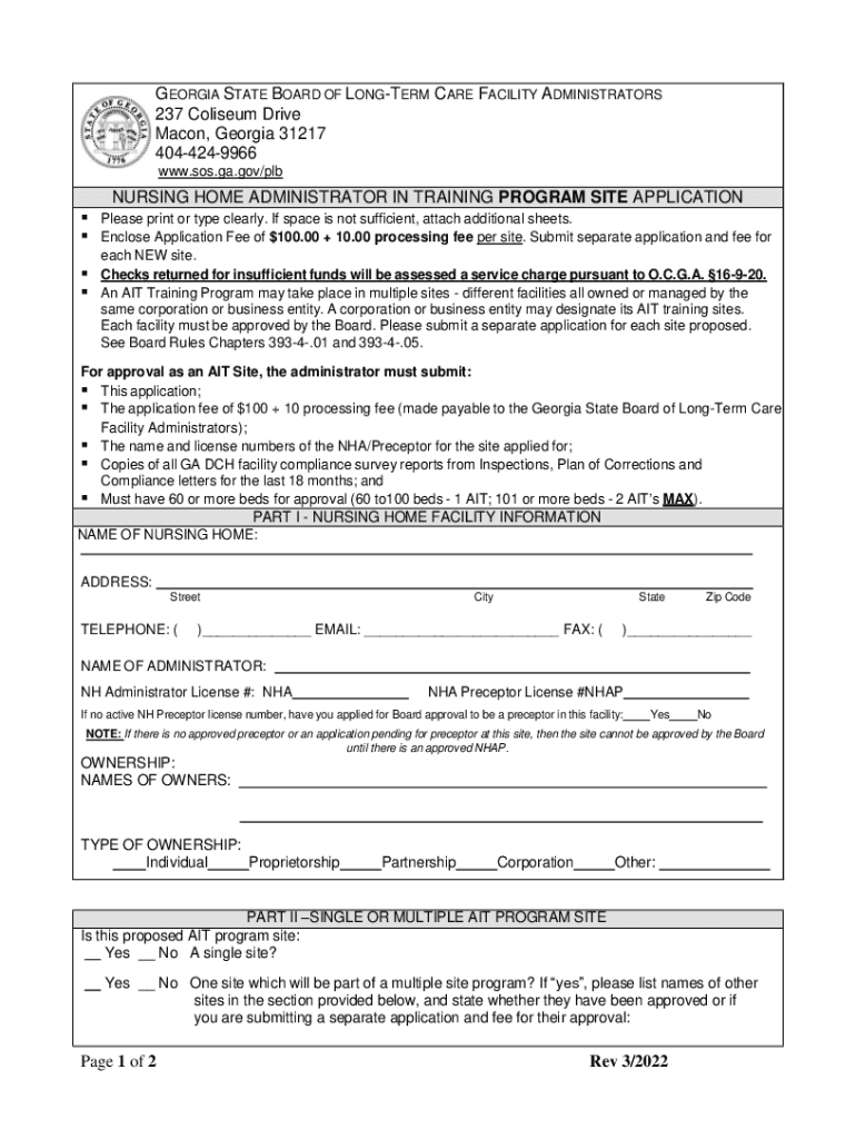 GEORGIA STATE BOARD OF LONGER CARE FACILITY ADMINISTRATORS 237 Coliseum Drive Macon, Georgia 31217 4044249966 www.sos.ga.gov/plbNURSING HOME ADMINISTRATOR IN TRAINING PROGRAM SITE APPLICATION Please