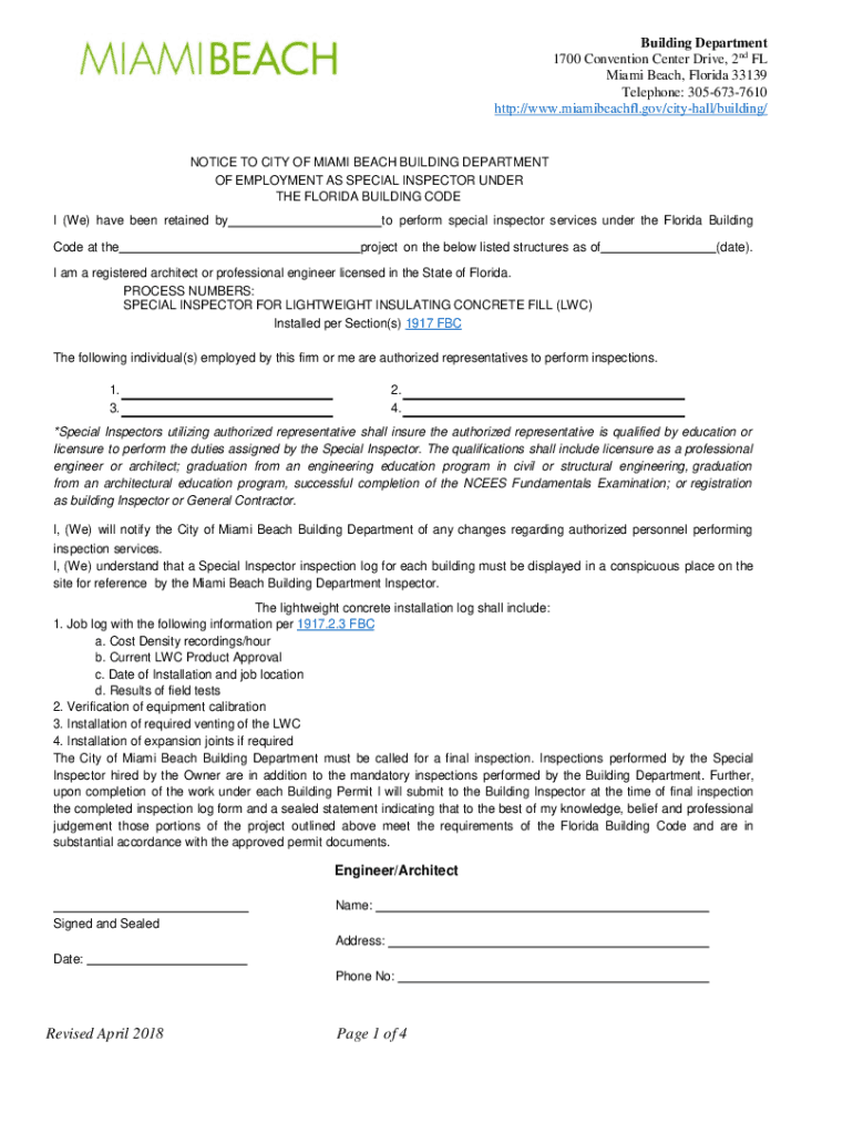 Building Department 1700 Convention Center Drive, 2nd FL Miami Beach, Florida 33139 Telephone: 3056737610 http://www.miamibeachfl.gov/cityhall/building/NOTICE TO CITY OF MIAMI BEACH BUILDING DEPARTMENT