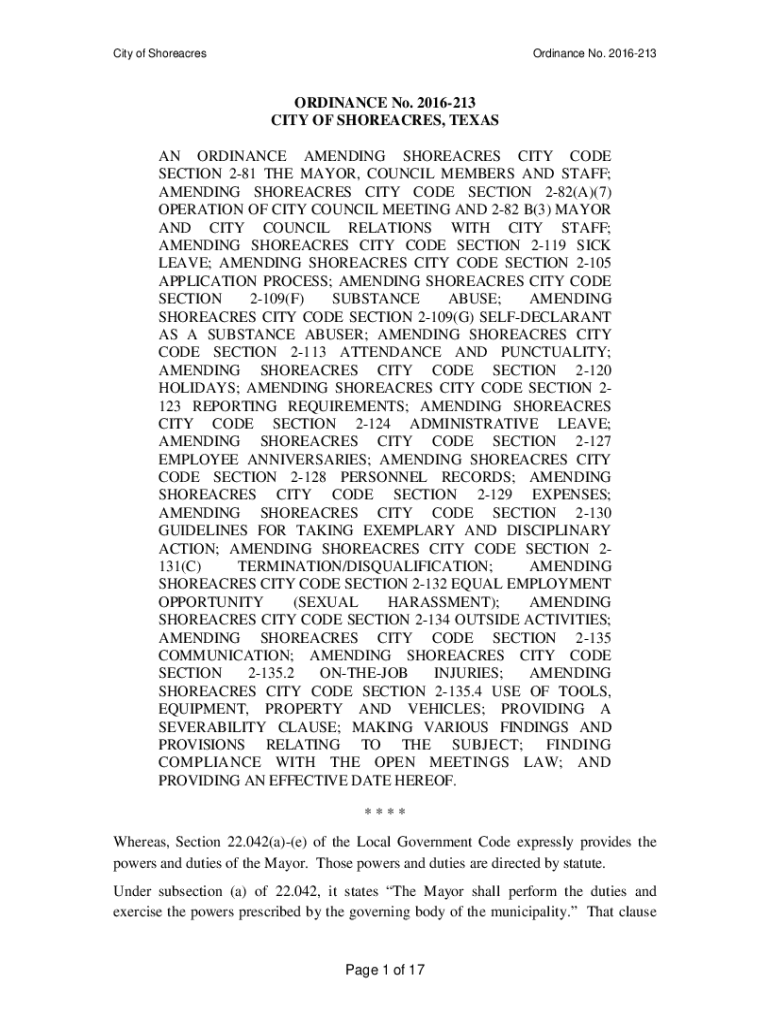 City of ShoreacresOrdinance No. 2016213ORDINANCE No. 2016213 CITY OF SHORTAGES, TEXAS AN ORDINANCE AMENDING SHORTAGES CITY CODE SECTION 281 THE MAYOR, COUNCIL MEMBERS AND STAFF; AMENDING SHORTAGES