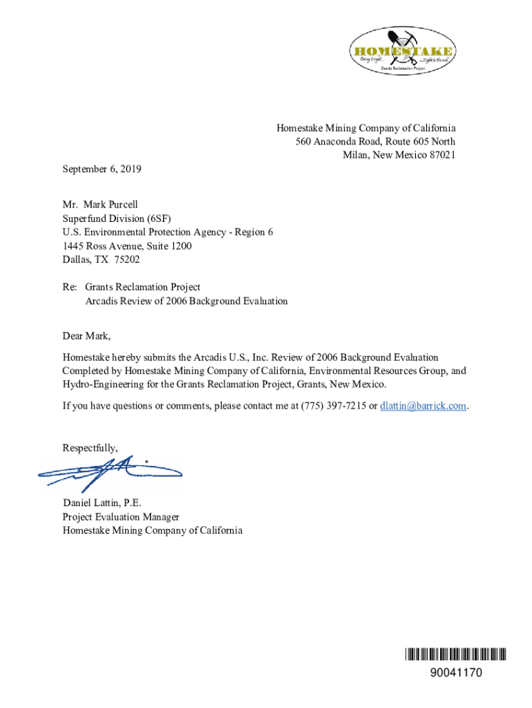 Home stake Mining Company of California 560 Anaconda Road, Route 605 North Milan, New Mexico 87021 September 6, 2019, Mr. Mark Purcell Superfund Division (6SF) U.S. Environmental Protection Agency