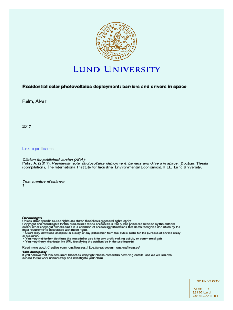 Residential solar photovoltaics' deployment: barriers and drivers in space Palm, Alvar2017Link to publicationCitation for published version (APA): Palm, A. (2017). Residential solar photovoltaics'