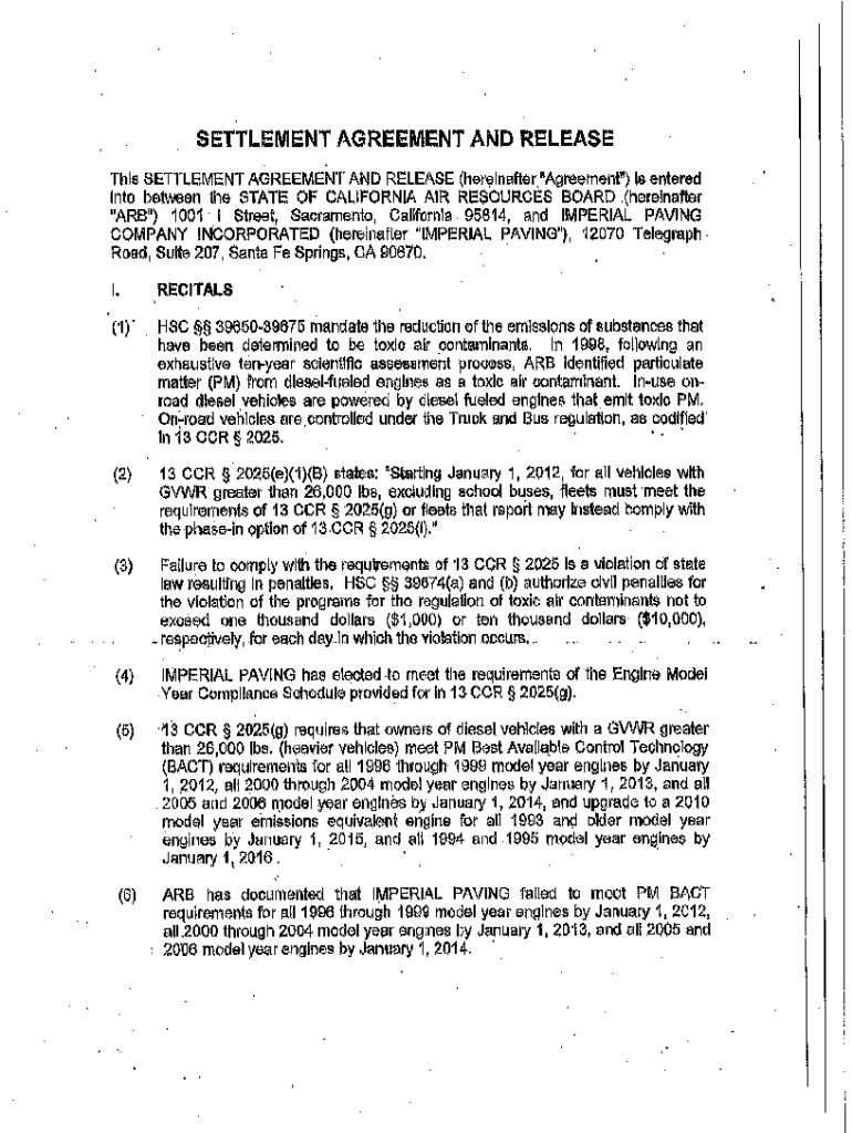 SETTLEMENT AGREEMENT AND RELEASE This SETTLEMENT AGREEMENT AND RELEASE (hereinafter \” Agreement\”) Is entered Into between the STATE OF CALIFORNIA AIR RESOURCES BOARD.(hereinafter \” ARB\”)