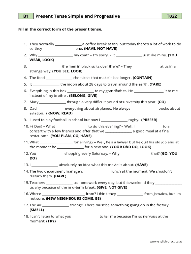 B1Present Tense Simple and ProgressiveT022Fill in the correct form of the present tense.1. They normally ___ a coffee break at ten, but today there\'s a lot of work to do so they ___ one. (HAVE, NOT
