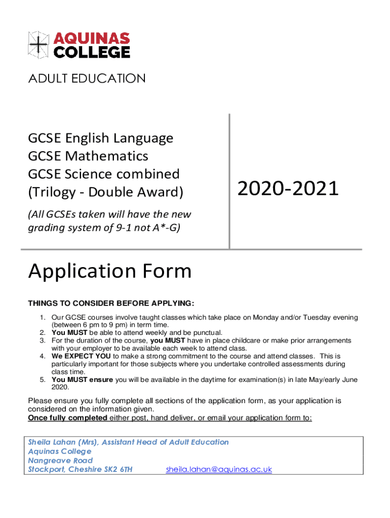 ADULT EDUCATIONS English Language GCSE Mathematics GCSE Science combined (Trilogy Double Award)20202021(All Gases taken will have the new grading system of 91 not A×G)Application Form THINGS TO CONSIDER
