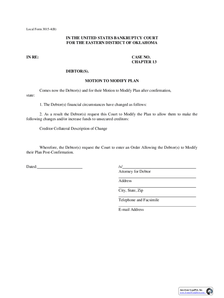 Local Form 30154(B)IN THE UNITED STATES BANKRUPTCY COURT FOR THE EASTERN DISTRICT OF OKLAHOMAN RE:CASE NO. CHAPTER 13 DEBTOR(S). MOTION TO MODIFY PLAN Comes now the Debtor(s) and for their Motion