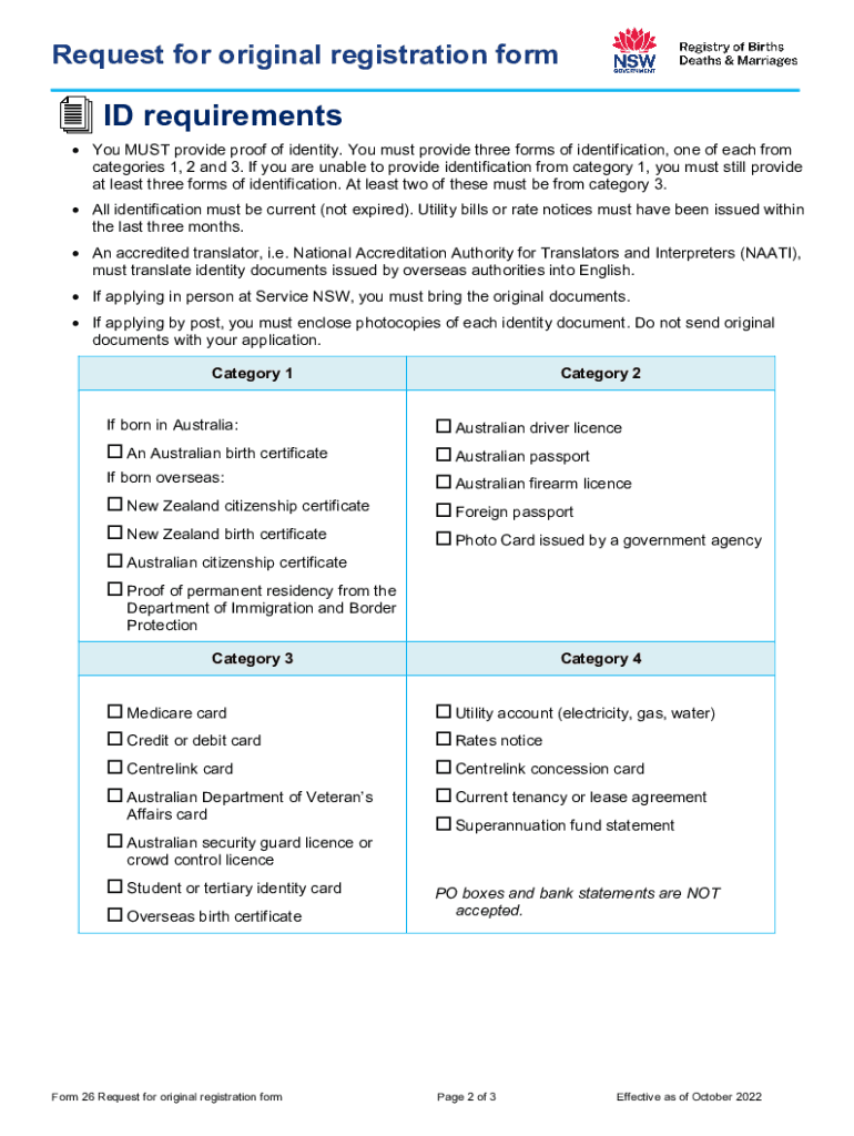 Request for original registration formGeneral information You are entitled to access the original forms of information or registration statement held by the NSW Registry of Births Deaths & Marriages