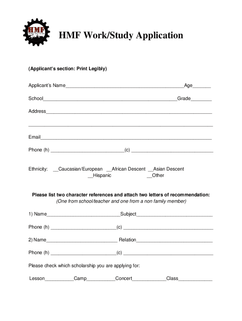 HF Work/Study Application(Applicants section: Print Legibly)Applicants Name___Age___ School___Grade___ Address___ ___ Email___ Phone (h) ___(c) ___Ethnicity:__Caucasian/European __African Descent