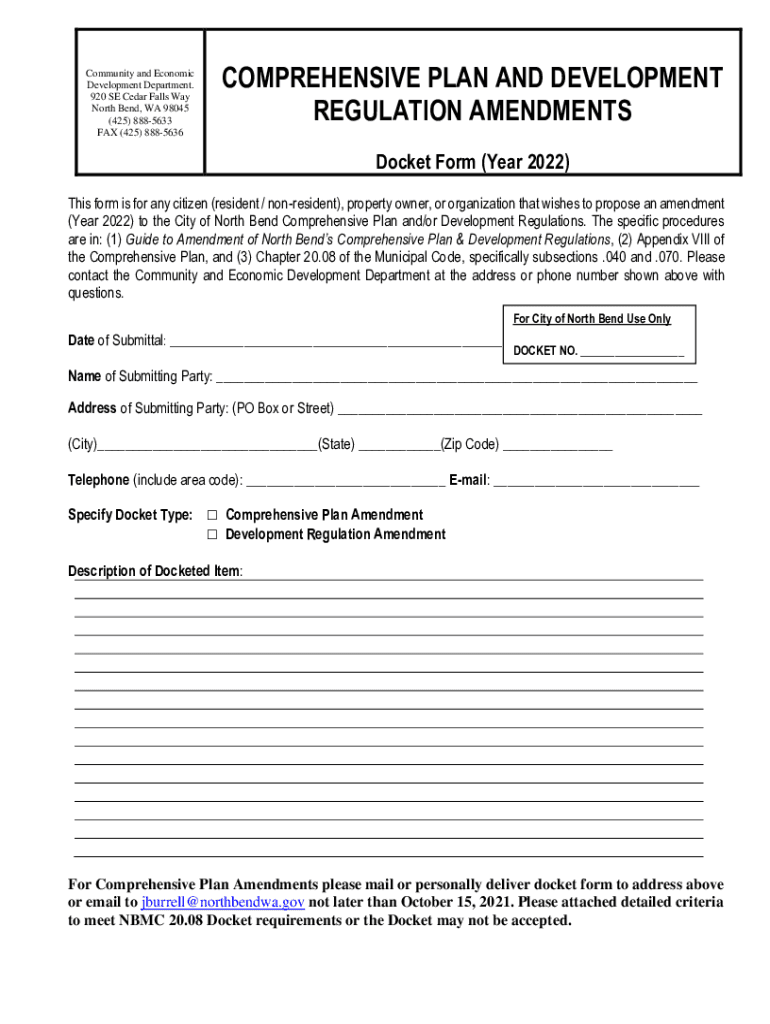 Community and Economic Development Department. 920 SE Cedar Falls Way North Bend, WA 98045 (425) 8885633 FAX (425) 8885636COMPREHENSIVE PLAN AND DEVELOPMENT REGULATION AMENDMENTS Docket Form (Year