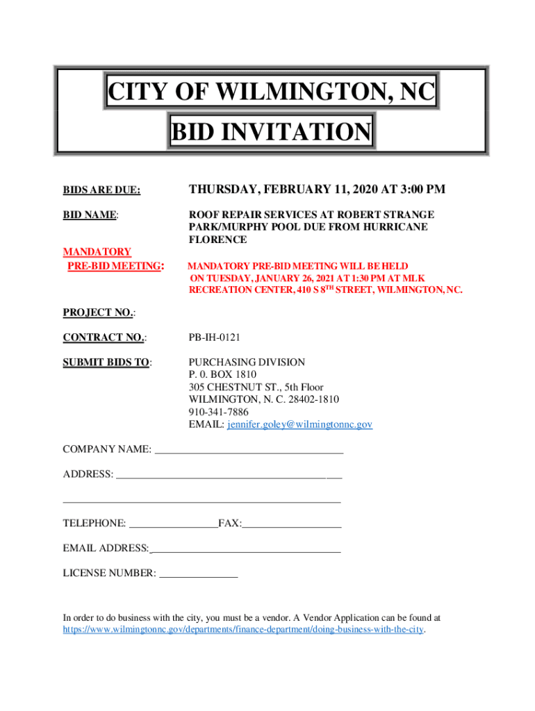 CITY OF WILMINGTON, NC BID INVITATION BIDS ARE DUE:THURSDAY, FEBRUARY 11, 2020 AT 3:00 PM BID NAME:ROOF REPAIR SERVICES AT ROBERT STRANGE PARK/MURPHY POOL DUE FROM HURRICANE FLORENCEMANDATORY PREBID